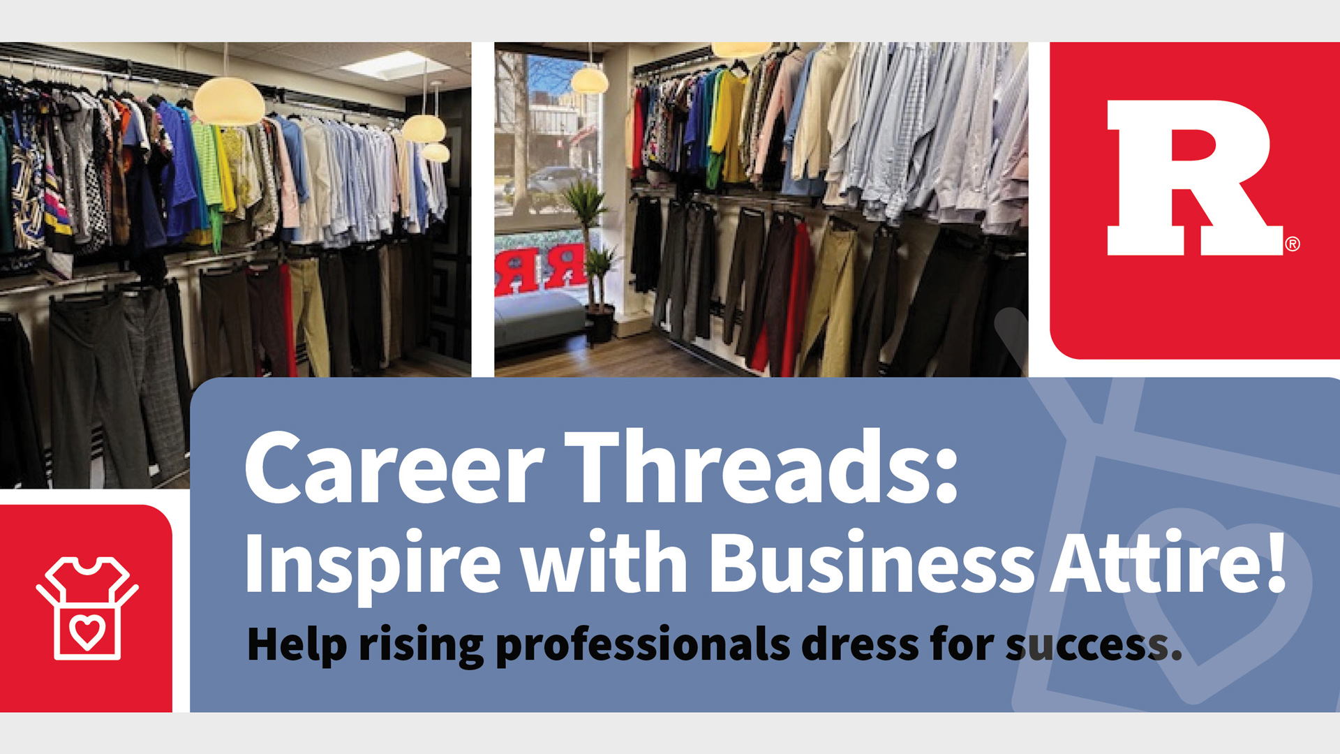 For donations of six or more items, we kindly request that donors schedule an appointment. Please contact us at careerthreads@newark.rutgers.edu to arrange a drop-off.